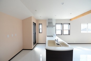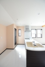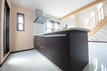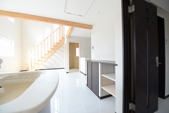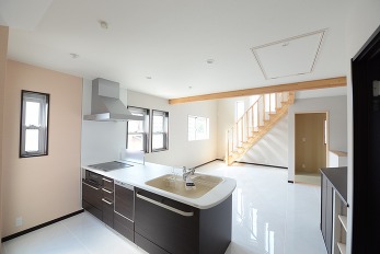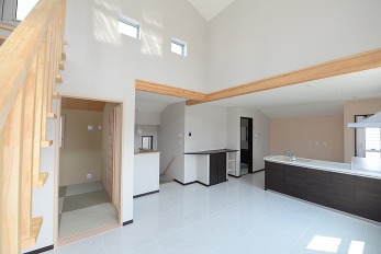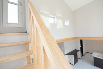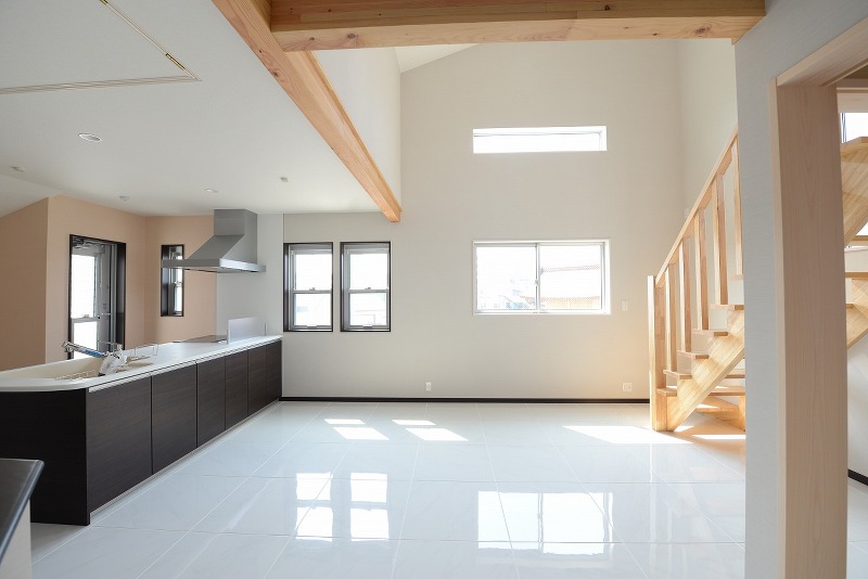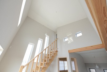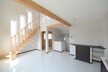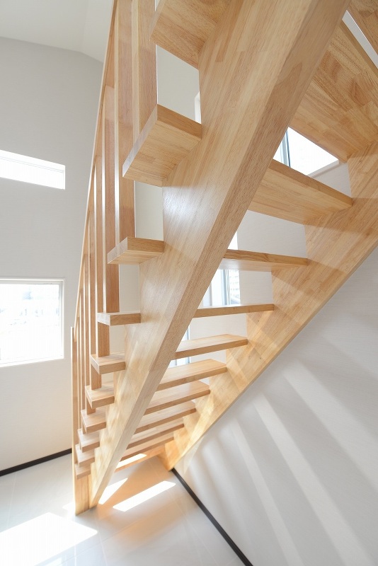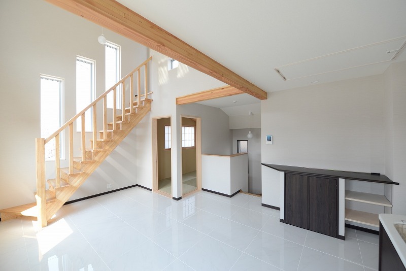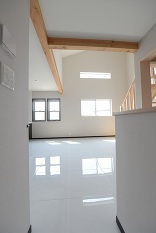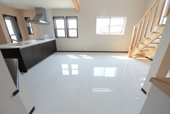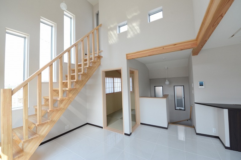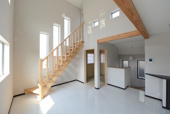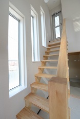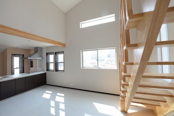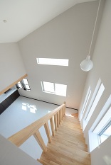 こだわりポイント2階にリビングを設置し、ストリップ階段と吹抜けで上部からの採光を取込みます。床にはセラミックタイルを敷詰め、ガス温水床暖房を設置しました。屋上にはバルコニーを設置して開放的な家が完成しました!